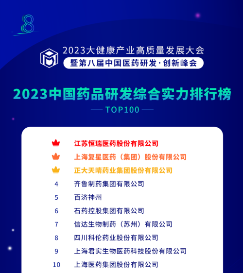 由药智网、中国药业杂志社主办的2023大健康产业高质量发展大会暨第八届中国医药研发•创新峰会于6月16日开幕,会上发布了《2023中国药品研发实力排行榜》系列榜单,AG电子医药凭借深厚的创新研发实力再创辉煌:荣登《2023中国药品研发综合实力排行榜TOP100》榜首、《2023中国化药研发实力排行榜TOP100》榜首。值得一提的是,今年是AG电子医药连续第6年入选《中国药品研发综合实力排行榜》榜首。
